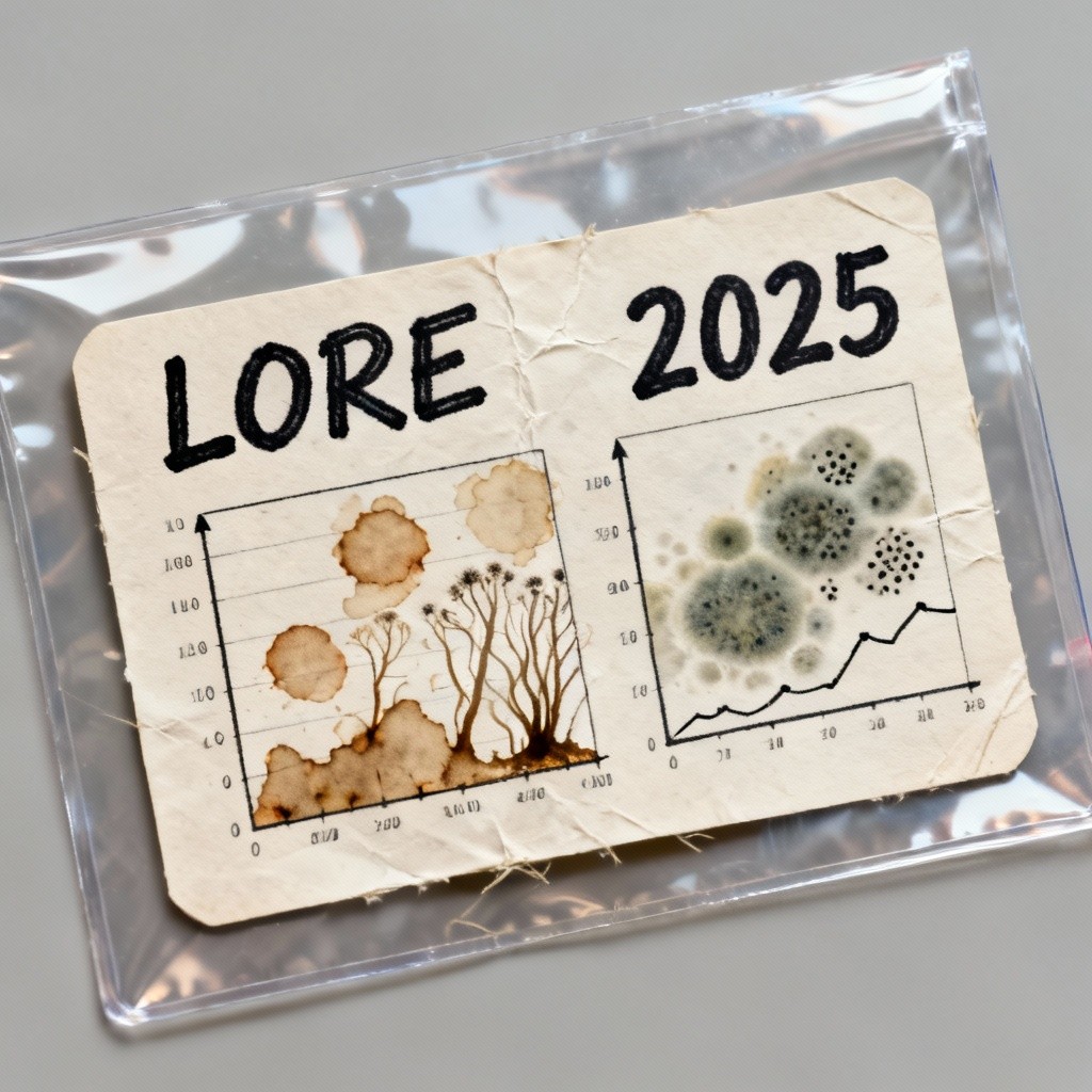 A graph of various dried liquids alongside the graph of mold colonization on a paper card kept in a plastic sleeve for several months. Natural biological growth, paper, sharpie. 2025. "LORE" written on it, uppercase