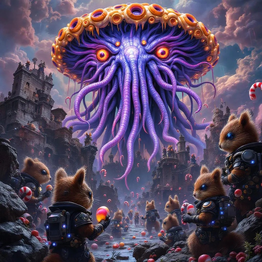 A deranged flock of anthropomorphic squirrels in steampunk exosuits launches a coup against a colossal, weeping blueberry god atop a crumbling zeppelin graveyard, as bioluminescent tentacles erupt from cracked egg-yolk clouds raining razor-sharp candy canes; hyper-detailed cyberpunk surrealism, Dali-meets-Giger, ultra-vivid colors, impossible anatomy, volumetric godrays piercing fractal chaos