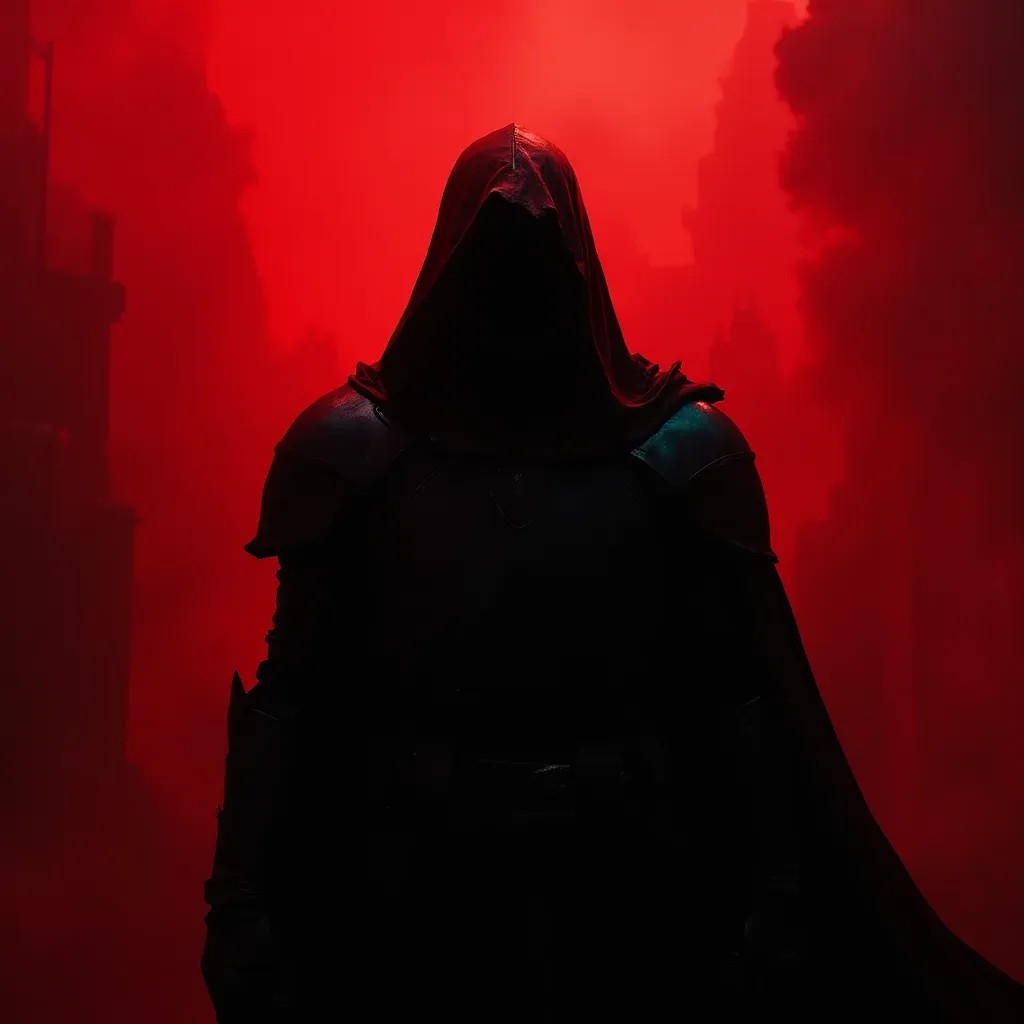 dark veiled knight of death, dark atmosphere with red sky, almost all black