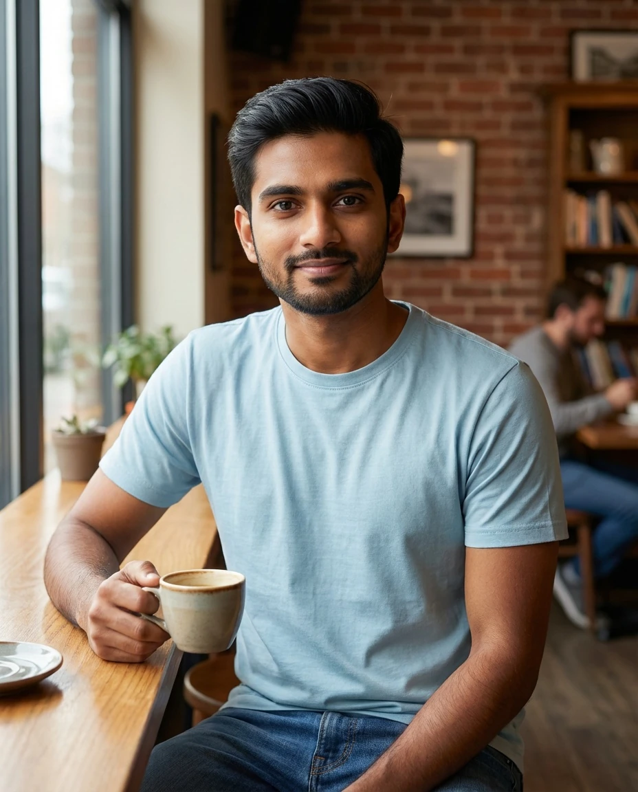 https://s.maginary.ai/results/f0d8ce8e84200ac659f2facce480a711/2_photoshoot_of_a_regular_indian_manu002c_average_looksu002c_22you002c_white_backg.webp dating app profile photo, cafe interior setting, smart casual setting, sophisticated & classy, setting, soft window light lighting, outfit, half-body portrait, facial expression should be "calm confident", natural skin texture, flattering composition, professional photography, sharp focus, shallow depth of field --ar 4:5 --flagship --3