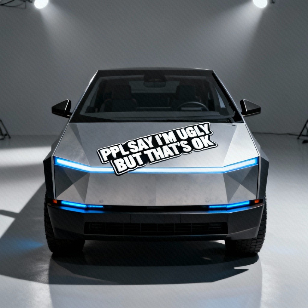 cybertrack with large sticker with clean uppercase white font on it that says "ppl say i'm ugly [next line] but that's ok"