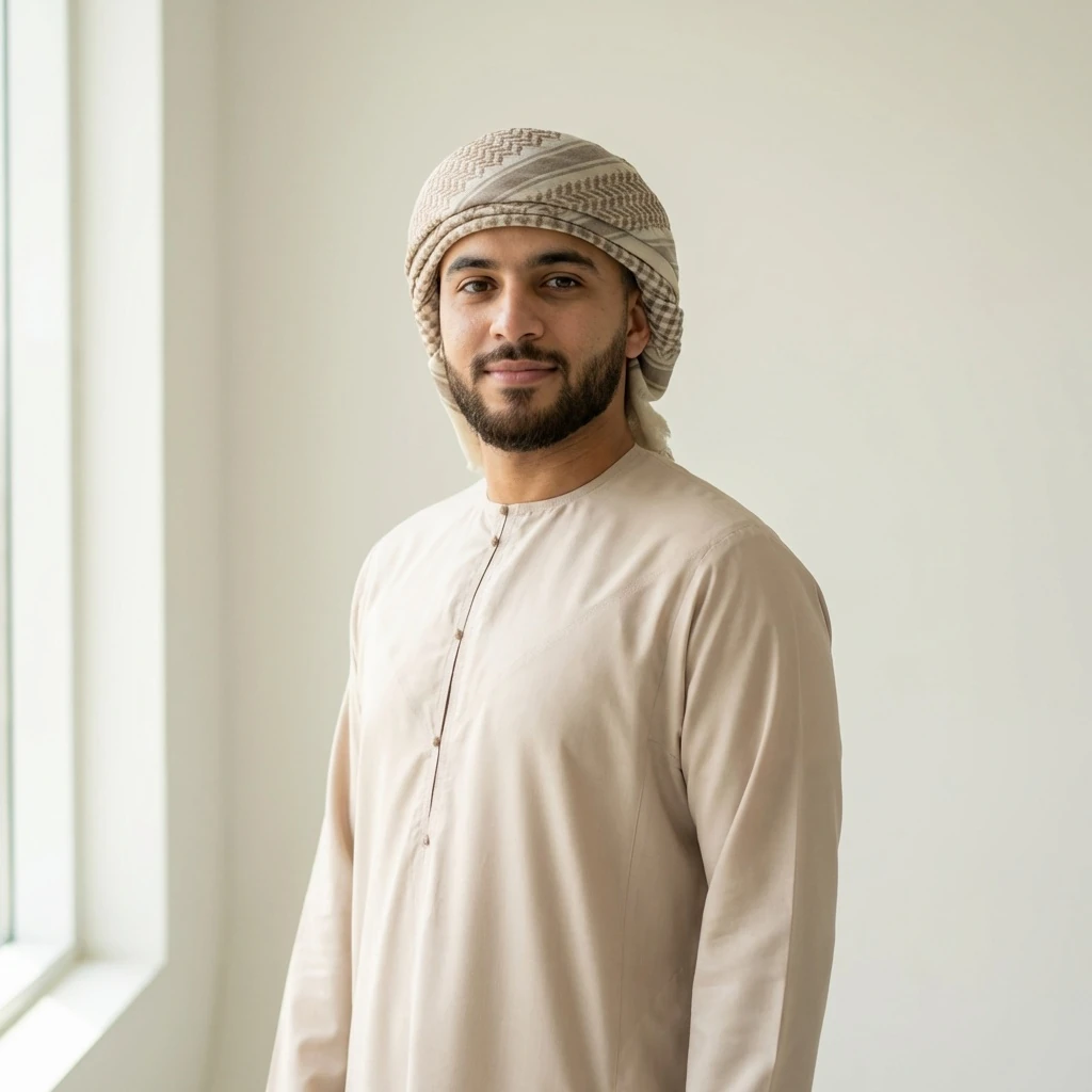 photoshoot of a regular arabic man, slightly arabic clothes, average looks, 26yo, white background --flagship --2