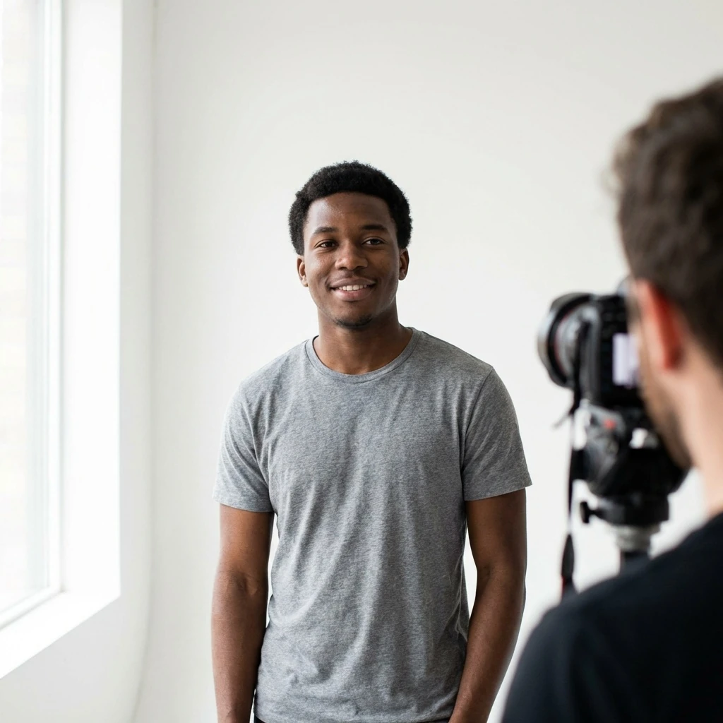 photoshoot of a regular black man, average looks, 26yo, white background --flagship --2
