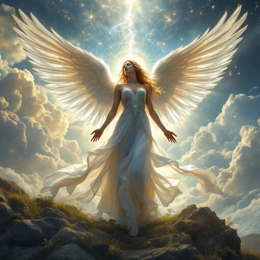 extremely detailed angel, high-contrast, heavenly scenery