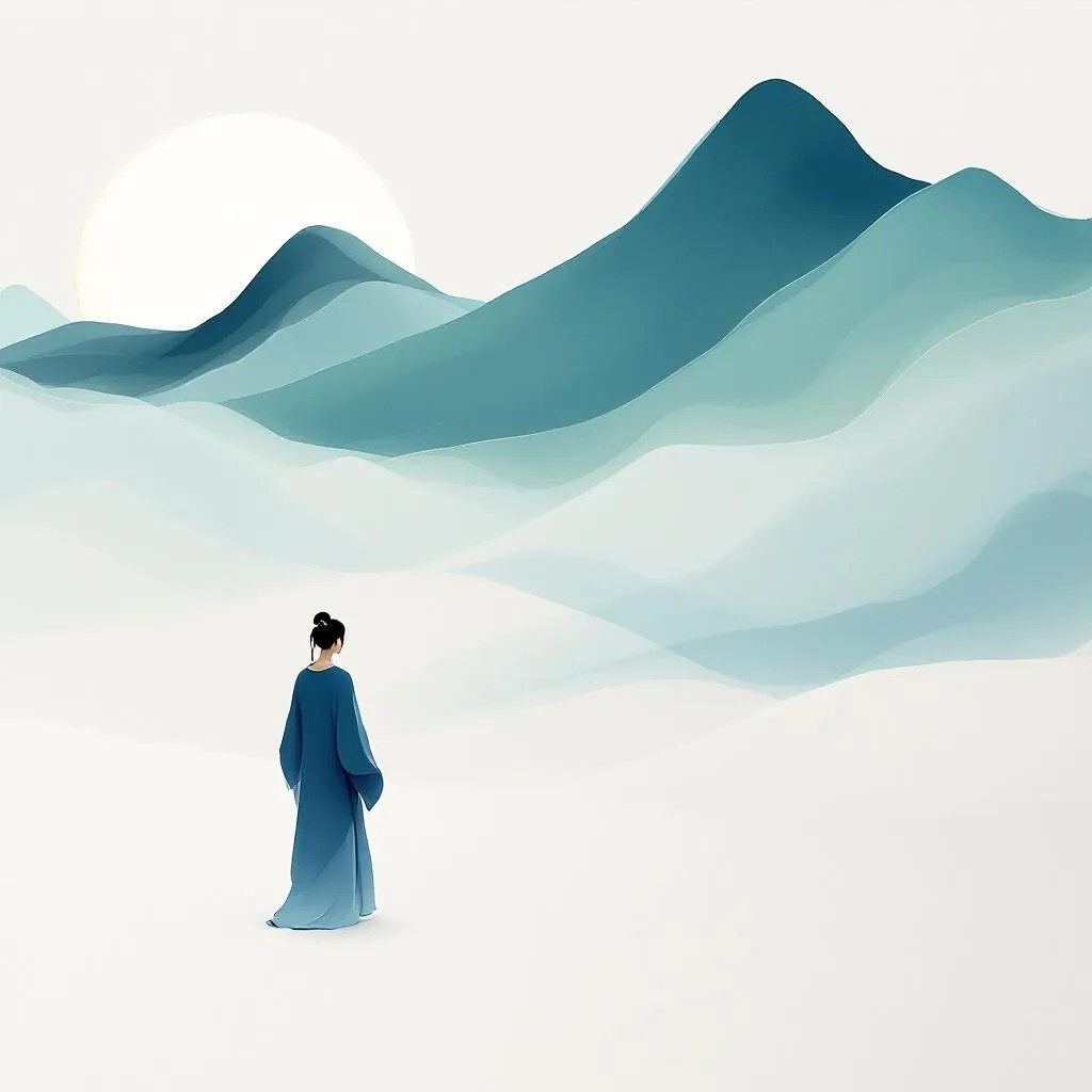 A serene and minimalist sumi-e style painting depicts a lone figure in traditional blue attire, viewed from the back, standing on a white ground. Above them and stretching into the distance are abstract, soft teal blue-green mountain ranges that almost appear like flowing ribbons or clouds. A large, radiant white full moon or sun is positioned behind the furthest mountain range, creating a soft glowing halo effect. The overall color palette is dominated by whites, light blues, and soft teal greens, evoking a sense of tranquility and a dreamlike landscape. The art style combines traditional ink wash painting with a contemporary minimalist aesthetic.